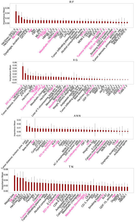 Important features identified with permutation feature importance (PFI) after training AI models on the primary staging dataset including biomarkers. These variables served as reduced datasets for model training to predict survival status. Features marked in pink represent shared important features between all models. A detailed description of the other features displayed can be found in Supplementary Table S1. RF = Random Forest, XG = Extreme Gradient Boosting, ANN = Artificial Neural Network, TN = TabNet, NK cells = Natural Killer cells, NANOG = NANOG homebox protein expression, TYMP = thymidine phosphorylase expression, TP-53 = TP-53 gene expression, IDO = indoleamine 2,3-dioxygenase expressed on tumor-infiltrating lymphocytes.