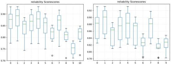 To ensure the high reliability of the questionnaire results, we set a threshold value of 0.8 for RS and numbered the 11 feedback items from 1 to 11. The RS of 10 feedback items exceeded the threshold value, whereas the RS of feedback-10 was 0.752; therefore, it was discarded. Each feedback item affected the RS of the other feedback items, and the RS calculated for each was considered to be a set. In Figure 2, the distribution of the RS set is shown. The median score of feedback-10 was significantly lower than that of the other types of feedback. After removing the influence of feedback-10, the remaining 10 feedback items had RS values between 0.8 and 0.9. The total mean value was 0.856, which exceeded the threshold, indicating high consistency among the 10 selected feedback items. Table 2 shows the consistency index of each feedback item, where RS(10) represents the RS generated by the remaining 10 feedback items after removing 10-feedback.