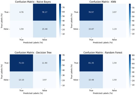 The confusion matrix results, as shown in Figure 5 and Figure 6 and Table 7, present XGBoost as the top-performing algorithm, boasting a high true-positive rate of 53.96%. However, it is important to note that XGBoost also exhibits the highest false-negative rate of 39.01%, which means it excels at correctly identifying positive cases but can miss out some true positives, potentially requiring further optimizations in certain scenarios.