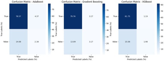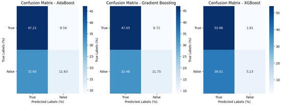 The gradient boost model achieved a true-positive rate of 47.05% and a true-negative rate of 11.75%. Similarly, the AdaBoost model exhibited a true-positive rate of 47.21% and a true-negative rate of 11.16%. This indicates that both models are fairly adept at correctly identifying positive cases while also maintaining a reasonable ability to correctly identify negative cases.