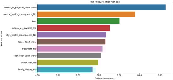 The analysis of feature importance in the dataset, as seen in Figure 4, conducted using a random forest classifier, provided valuable insights into the factors that wielded the most substantial influence when it came to predicting mental health consequences. These findings are essential for understanding the dynamics of mental health in the workplace and can inform strategies for better support and intervention.