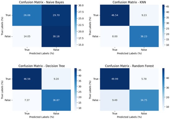 In contrast, the naive Bayes model displayed the poorest performance in terms of true-positive and true-negative rates, achieving a meager true-positive rate of only 26.06% and a true-negative rate of 30.18%. On the other hand, the decision tree and random forest models showcased relatively robust performances, with true-positive rates of 46.56% and 49.99%, respectively.