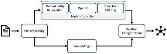 Our methodology employs open information extraction (OpenIE) for the automated identification and extraction of relationships, facts, and entities from unstructured text without relying on human intervention. OpenIE typically starts by segmenting sentences from the text. Then, it performs part-of-speech tagging and dependency parsing on each sentence to identify its grammatical structure, including the roles of words and their relationships within the sentence. To simplify the identification of relations in sentences, nominalization is applied to transform verbs into nouns. Candidate relations and their corresponding arguments (entities or noun phrases) are identified based on the grammatical structure of the sentences using patterns and heuristics. Relations are extracted as fact triples that consist of a subject, a relation, and an object.
