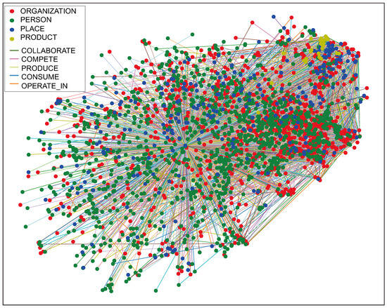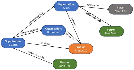 Then, we derive an ontology from schema.org (https://schema.org, accessed on 27 December 2023) with entity types that include organization, person, place, and product. The entity type Organization represents such concepts including the company and business. The entity type Person represents the concept of people. The entity type Place represents the concept of a geographical place. The entity type Product represents products. The relationships are labeled according to the types of entities they involve. When the type of entity involved in a relationship is an organization or person the relationship type is either in competition or collaboration with, it is denoted as “collaborates with” or “competes against”, respectively. When the relationship is between an organization and a place, the relationship type is “operates in”. For a relationship involving an organization and a product, possible relation types are “consumes” and “produces”. Table 1 summarizes the valid relationships with the type of entities as the source and destination, as well as their type of relationship. Figure 2 provides a visualization of a possible graph based on the defined ontology.