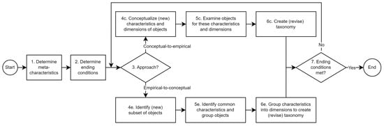 The design of this methodology can be considered as a search process for a useful taxonomy []. Therefore, Nickerson et al. [] define objective and subjective ending conditions (Step 2) as a crucial point to evaluate the usefulness of the developed taxonomy (see Table 1). We use a subset of the objective ending conditions that are related to the correctness of the taxonomy and the process, whereas subjective conditions ensure that the taxonomy is meaningful and practical [,].