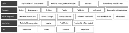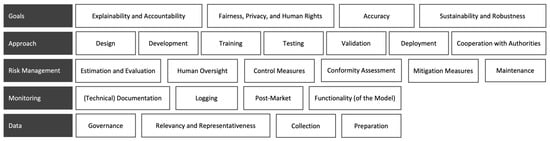 As the last dimension, we include the regulatory principles addressing the “data”, which set out the characteristics regarding “governance”, “relevance and representativeness”, “collection”, and ”preparation” [,,]. The regulatory principles for data are even more detailed and define the criteria for preventing any systematic discrimination, so we decided to consider “data” as a separate dimension. The taxonomy after the first iteration can be seen in Figure 2 (Step 6e).