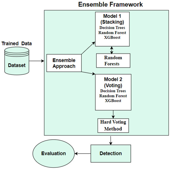Ensemble models have been used in many fields for detection using ML. The authors in [15] developed an ensemble model to detect cyberbullying in their new dataset with binary classification as their dataset was categorized using binary labels. In the first step, they attempted to improve upon SVM. For their second strategy, they relied on DistilBERT, a more-efficient and -compact rendition of the transformer model BERT. When they combined the first three models, they obtained two more ensemble models. In comparison with the other three models, they found that the ensemble models outperformed the base model on all evaluation metrics except precision. With an ensemble model, they achieved an accuracy of 89.6%, surpassing the SVM model, which yielded an accuracy of 85.53%. The DistilBERT model achieved the highest accuracy of 91.17%. In their experiment, various TF-IDF feature-extraction approaches, including word, character, and N-gram sequencing, were empirically evaluated and compared using an SVM model. In another example of ensemble models for analyzing detection, the authors in [16] proposed a stacking model to detect short message service (SMS) spam. They identified stacking as a method of ensemble learning used to improve model predictions by aggregating the results of numerous models and passing them through another ML model. They developed an ensemble model with bag of words feature extraction to enhance their model’s performance, naming it AstNB—a new augmentation and stacking approach combined with the transfer learning approach of Naive Bayes (NB). Their goal in this experiment was to detect SMS spam across multiple datasets, achieving the highest accuracy of 98.1% for detecting spam SMS domains.