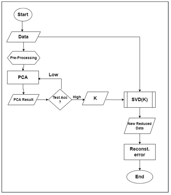 The steps above define all of the steps in the proposed method. The method relies on statistical deductions of principal component analysis [29] to select principal components with high priority that represent the dataset to a good degree. This representation is verified using different machine learning algorithms to test the accuracy of the representation against the class. The top-k selected principal components become the guide to selecting the feature vectors from the SVD algorithm, hence the use of feature reduction and selection methods.