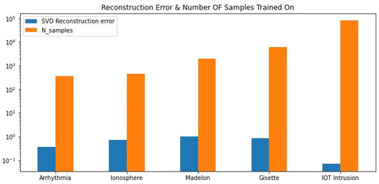The result of the experiment shows that PCA can be used to determine the number of features to retain in the SVD decomposition. The performance of the result was consistent across different datasets because we observed that the greater the ratio of SVD-selected features to the original features, the lower the reconstruction error, and vice versa. The accuracy was directly proportional to the ratio of the SVD-retained feature to the original features and inversely proportional to the reconstruction error. In other words, the higher the number of features retained from SVD decomposition, the greater the accuracy and the lower the reconstruction error. The results show that this model can be applied to different datasets and to large datasets. The results shown with the large IoT dataset showed that the experiment performed well with a large dataset, as can be seen from the high accuracy of 0.975 and low reconstruction error of 0.069.