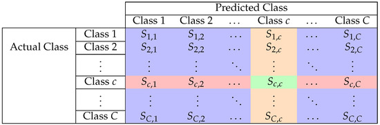 Example confusion matrix color-coded for measuring the success metrics pertaining to class c. True positives () are in the green cell, false negatives () are the sum of the red cells, false positives () are the sum of the orange cells, and true negatives () are the sum of the blue cells.