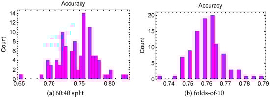 Two histograms illustrating the distributions of accuracy calculated from random train–test partitions of the dataset Heart, classified using Euclidean distance by a 1-nearest neighbor classifier. (b) is 100 trials from random folds-of-10, whereas (a) is 100 trials of 60:40 random train–test partitioning. Classes were represented proportionally in both the train and test sets.