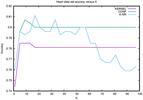 The accuracy of a traditional K-NN classifier compared with the accuracy of a confidence voting and ridge regression (KRR) classifier using the LSSLD kernel on the Heart dataset. The accuracy of the traditional K-NN classifier varies significantly depending on the value of K, degrading as K increases. In contrast, confidence voting and ridge regression using the LSSLD kernel report consistent accuracy across all values of K.