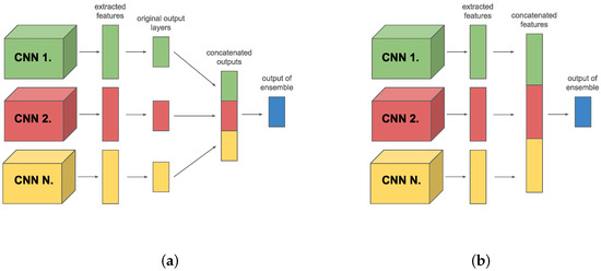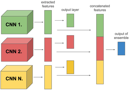 One method is to connect the separate CNNs through an additional fully connected (FC) layer inserted after the last FC layer of the original CNNs. In addition, another strategy is used, where the last FC layers of the model components are combined by a label-weighted average, where the parameters of the average calculation can be learned. Finally, we adopt a method in which, although each member model has its own FC layer, these are used exclusively to compute the combined loss function. In contrast, for the linking we combine the feature extraction layers of the member components and place the new fully connected layer on top of them. This multi-layered approach allows us to exploit the strengths of each model component while improving classification performance and increasing the model’s generalization ability.