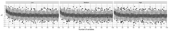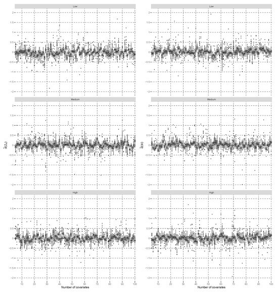 Here, the simulation results are shown for the null hypothesis that covariate one does not contribute to interaction effects (). Figure 1 shows the difference defined by , minus the normalized rank quantile of the standard normal distribution on the left side. was estimated based on 100 independent replicates of , given the number of covariates and the correlation of each scenario. All boxplots fluctuate around the value of zero across different number of covariates. Furthermore, the boxplots on the left side, , of Figure 1 are comparable to those on the right side, , which used a standard, normal, distributed random variable, , instead of . Note that the volatility in boxplots occurs due to the estimation of ranks, and with increasing sample sizes, the differences in would converge to zero. The Shapiro–Wilk test [36] is considered the most powerful in detecting non-normality according to [37]. If all 288 scenarios were evaluated with the Shapiro–Wilk test and adjusted for multiple comparisons with a false-discovery rate approach [38] of 0.05, then there would be no case that significantly departed from the normality distribution assumption.