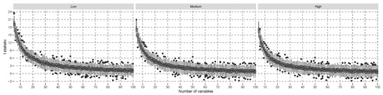 The results for the alternative hypothesis specified in Equation (27) are shown in Figure 2. There is a decreasing trend to shift the distribution of more towards zero the higher the number of covariates. With low covariate correlation, the lower quartile of the distribution crosses the zero line with about 30 covariates. When the covariate correlation is higher, this happens with about 20 covariates. In such cases, it is expected that power is reduced because the distribution becomes more similar to the distribution. After about 30 covariates, the median of does not decrease further. For comparison, the same simulation was conducted using the t-statistic in a linear model of the interaction effect in Figure 3. This figure shows a decreasing trend in the location of the simulated t-value distribution, but the gap of the medians to zero is larger than in Figure 2, and more covariates are needed so that the lower quartile of the simulated distribution crosses the zero line. The model-specific hypothesis test that was explicitly developed for linear models can be expected to be more efficient in terms of power than a model-agnostic hypothesis test if the assumptions are justified. In conclusion, the proposed test statistic is empirically good when approximated with a normal distribution under , and small effects under result in similar behavior to t-tests with linear models.