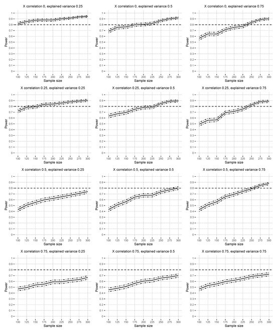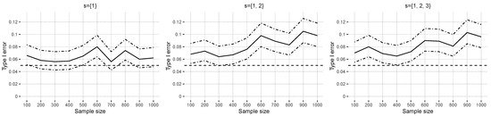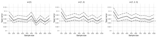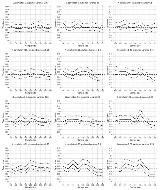 The rows of plots in Section 4.2.1 and Section 4.2.2 correspond to different covariate correlations, , and the columns of plots display varying explained variances, . The dotted–dashed lines represent the upper and lower bounds of the exact pointwise Clopper–Pearson confidence intervals [39] that were calculated for the type I error and power proportions. The next two sections, Section 4.2.1 and Section 4.2.2, summarize the type I error and power simulation results consisting of hypothesis tests. Additional figures are available in Supplementary Materials Section S4.