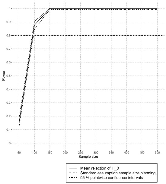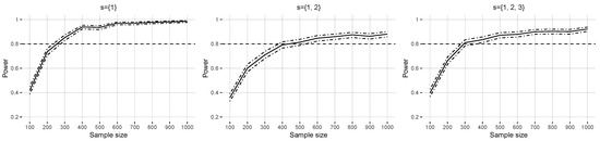 The error variance was optimized on a data set with prior to the simulation to approximately yield an explained variance of , and . Sample sizes varied with . Lower and upper sample sizes were chosen to avoid instabilities in the estimated coefficients and reach power levels of 1 in at least one scenario. Three different null hypotheses, , were investigated. The linear model was specified under to estimate all possible main and interaction effects up to the third order. In contrast, under all interaction effects that included covariates of set s were excluded from the data-generating process. Each combination of the scenarios was repeated independently 1000 times.