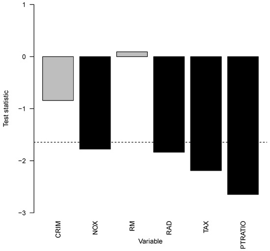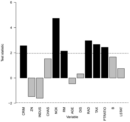 This section summarizes the results of the data analysis example. The Boston Housing prices data set from the US census in 1970 [48] was explored for comparison to the data set investigated by [22]. The median value of owner-occupied homes in 1000s of USD was the quantitative response. All available other variables were used as covariates in an extreme gradient-boosting model [49]. The data set was split randomly into tuning data (50%) and a test data set (50%). The tuning data were split again with five times repeated 25-fold cross-validation to tune all possible pairs of the number of boosting iterations and the maximal tree depth . The learning rate was set constant to , and subsampling of the rows and columns was done with a probability of . The tuning parameters with the lowest MSE were 2000 boosting iterations and a tree depth of 4. Let the performance measure be the average absolute prediction error of the model M divided by the average absolute prediction error of the median response. Evaluating on the test set with the model results in . Note that the mean of over all tuning grid values, , was comparable to the results of [22]. Testing the null hypothesis of no interaction between all covariates gave a p-value of . Thus, interaction effects have an impact. To assess which covariates contribute to interaction effects, all sets were investigated in Figure 13. All covariates above or below the dashed line per capita crime rate by town (CRM), nitric oxides concentration with parts per 10 million (NOX), average number of rooms per dwelling (RM), index of accessibility to radial highways (RAD), full-value property tax rate per 10,000 USD (TAX), and the pupil–teacher ratio by town (PTRATIO) contribute to interaction effects for Boston housing prices. All of those covariates have positive values for the test statistic, which means that those interaction effects overall increase the variability of the prediction model.