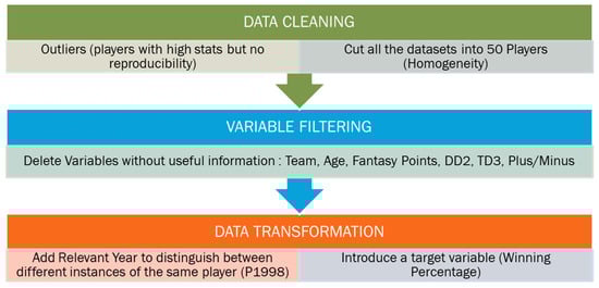 Figure 1 illustrates the data preprocessing for the NBA clutch performance analysis procedure, outlining a structured workflow that begins with ‘Data Cleansing’. In this initial phase, outliers—players with inconsistently high statistics—are identified and addressed to ensure data quality. Additionally, to achieve uniformity across datasets, only the top 50 players are retained, enhancing homogeneity. The next step, ‘Variable Filtering’, involves the strategic removal of certain variables such as ‘Team’, ‘Age’, ‘Fantasy Points’, ‘DD2’, ‘TD3’, and ‘Plus/Minus’, deemed extraneous for the study’s focus, streamlining the dataset. The final stage, ‘Data Transformation’, includes adding a ‘Relevant Year’ attribute to distinguish performance across different seasons for the same player and introducing a ‘Winning Percentage’ as the target variable to precisely measure the impact of players’ performance on game outcomes.