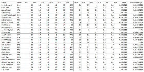 The process of data collection, embodying the systematic gathering of information on pertinent variables from a multitude of sources, is undertaken with the objective of addressing data-centric inquiries or facilitating data-driven projects. It encompasses the integration of diverse data types and sources, ranging from observational data to digital formats such as .csv and text files. The web scraping technique is used for the automated extraction of online data. For the acquisition of data in this project, traditional basketball statistics spanning from the NBA season of 1996–1997 through to the 2017–2018 season were utilized, resulting in the compilation of 44 .csv files, with each year providing separate files for the regular season and the playoffs [37,38]. The methodological approach to data collection was twofold: firstly, the direct download of accessible Excel workbooks was employed wherever feasible; secondly, data-scraping techniques were applied, utilizing the Python programming language and its associated libraries to gather the required datasets.