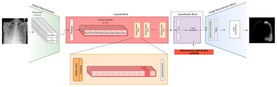 47]. Through stacking multiple convolutional blocks, the extraction of essential features is facilitated, effectively removing unnecessary information and generating a condensed set of capsules. This stacking mechanism enables the model to project the input image onto a higher-dimensional space, thereby facilitating subsequent steps in capsule formation. A key innovation lies in utilizing the same convolutional blocks found in conventional CNNs, allowing for seamless transfer of the feature extraction part and the network’s learned weights to different networks. This approach also enables integration with SOTA models for connecting to subsequent capsule components. The choice of layer and filter quantities is customizable by the user and varies depending on the dataset’s complexity. Simpler datasets need fewer layers and filters, while more intricate datasets require a greater number of layers or filters. Nevertheless, the minimum required number of filters remains smaller than that of traditional convolutional networks.