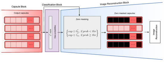 To be able to reconstruct more complicated images from only a few features, the novel idea of this paper was to create a different and more sophisticated architecture. The decoder block selectively masks the outputs of all capsules in the final capsule layer, except for the longest capsule (representing the classification result) or a capsule manually designated for a needed purpose, achieved by element-wise multiplication with a one-hot encoded vector corresponding to the target label. This manual choice approach enables segmentation based on the positive class alone, potentially yielding valuable insights from images classified as negative. Moreover, during training, the true label is consistently designated as the target, rather than the predicted label, to facilitate the training process. The masking operation is shown in