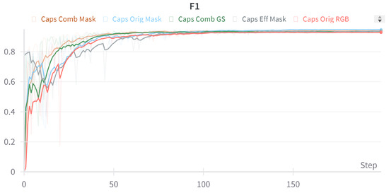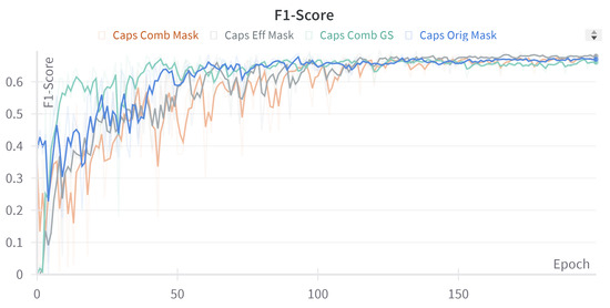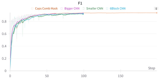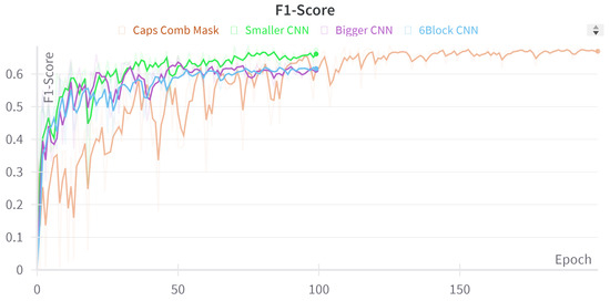 The performance progress across epochs differs between capsule models and CNNs. Capsule models exhibit a slower start but eventually surpass convolutional models in performance. This can be attributed to the more complex nature of training capsules, as they need to learn connections of features in an additional dimension and require multiple passes over the dataset to achieve the desired generalization. In contrast, training fully connected layers in CNNs, which operate in one dimension, can be accomplished in fewer epochs. However as the structure is simpler, the CNNs are not able to reach the performance of capsules.