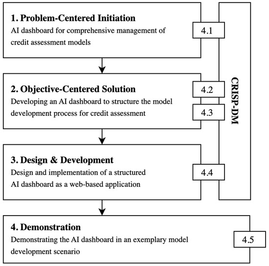 To target the research gap outlined in the first section, we employed a problem-oriented design science research approach (DSR) according to Peffers et al. [23] in combination with CRISP-DM [24] to structure and support the process of model development for credit assessment with an AI dashboard. DSR helps us to structure the research process while identifying the problem, analyzing requirements, and developing artifacts (Figure 1). Moreover, due to the structure of CRISP-DM across industries for data mining processes, it provides a fundamental and appropriate basis on which to structure the process of model development and model evaluation for credit assessment with an associated understanding of business and data.