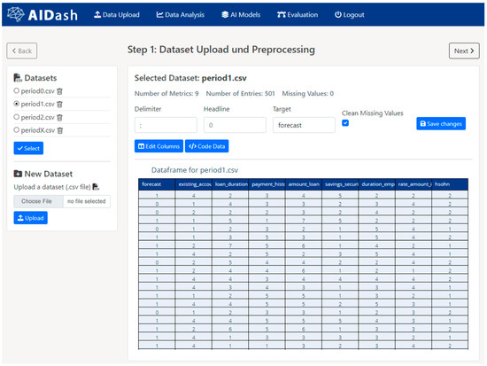 The first module provides the functionalities to support the data understanding and preprocessing aspects of CRISP-DM. First, a new dataset can be uploaded in CSV format or selected from the list of already uploaded datasets (Figure 4). The artifact provides an overview of the uploaded or selected dataset so that the user can change the parameters for the import if there is incorrect formatting, e.g., caused by an incorrectly selected delimiter. Then, once the file has been read correctly, the target variable must be specified. The selected delimiter, the position of the header line, and the name of the target feature in the dataset are saved in the database.