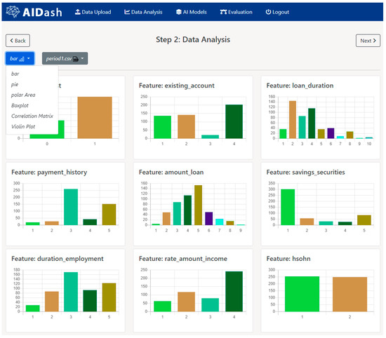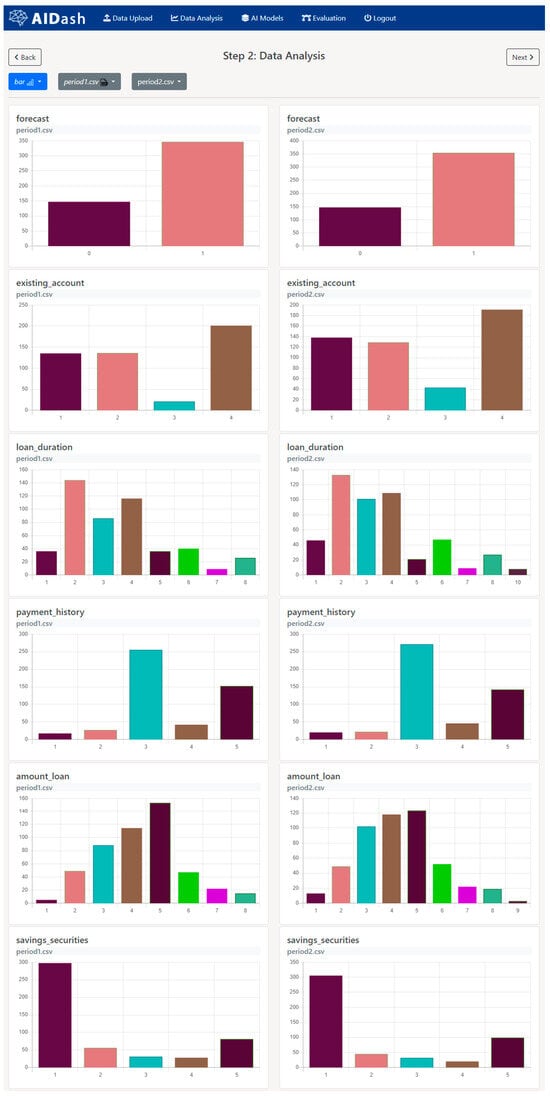 Based on the periodic nature of credit scoring datasets, the first module (Section 4.4.1) provides the functionality to upload a new dataset to compare multiple datasets (between Dperiod1.csv and Dperiod2.csv) and model behavior. Moreover, after the final selection of features from the dataset (see Figure A5), the coding process of features can be conducted (see Figure A6). Since both datasets were already coded, it was not necessary to make further adjustments to the features, and the next step began with the comparison of the feature distributions between datasets, e.g., the current and the next period, on the plot module before training the model (Appendix A).