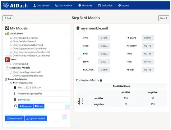 Due to the identified changes in the new dataset, it was necessary to develop a new model to assess the performance and ensure system safety. To do this, the model module (Figure 6) provided the functionality to manage the modeling process. The definition of a new model with AIDash is assisted by the predefined parameters, which can be further refined if necessary. However, the new dataset contained more “good” than “bad” loans, which was balanced out during the development of the new models (Figure A12). To enable a comparison on the dashboard module to find the best among all existing modeling techniques, we created several models from the list of techniques provided by AIDash.