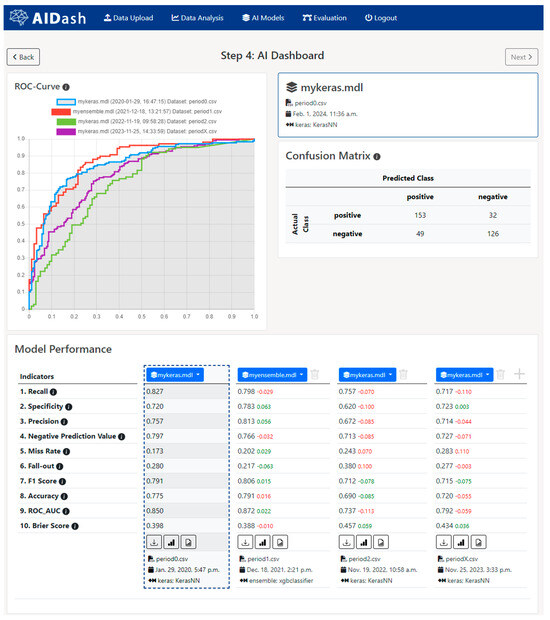 In the last step of the process, AIDash provides a comparison view of multiple models. In order to demonstrate the model evaluation process, XGB, and DT models trained with Dperiod2.csv and Dperiod1.csv were added so that the performance of each model could be analyzed (Figure 9). Thus, AIDash was able to promote a periodical comparison between the existing and newly trained models. However, in this step, it was necessary to iteratively add/remove models to/from this view for comparison before the final decision was made. In this case, the XGB and DT models allowed us to assess the transition in model performance between the two periods and datasets.