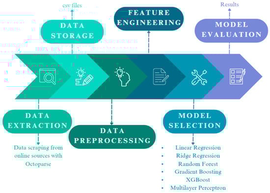 For this study, several libraries were used, including Pandas for data manipulation and analysis and Matplotlib for data visualization. Furthermore, sklearn was utilized to implement and evaluate the ML models. Ultimately, the assessment of the outcomes was conducted using three metrics: MAE, MSE, RMSE, MAPE, and R-squared. These metrics provide valuable insights into the dependability and effectiveness of the models, and their analysis is presented in the following section. Figure 1. presents a flowchart for the proposed methodology.
