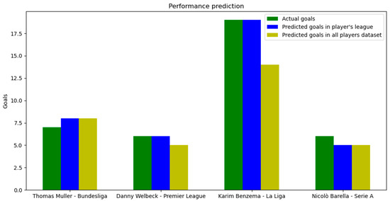 T. Müller, a forward, scored a total of 7 goals in the 2023–2023 season. The random forest algorithm predicted 8 goals when applied to the elite players dataset, resulting in a 1-goal discrepancy. Similarly, the XGBoost algorithm, using data from all four leagues, also predicted 8 goals for Müller, aligning closely with the random forest prediction. For D. Welbeck, who is a midfielder, XGBoost precisely predicted the number of goals he scored in the final season using the league-specific dataset. In contrast, XGBoost, employing data from all four leagues, predicted 5 goals. In the instance of Karim Benzema, a striker who scored 19 goals, the MLP model accurately predicted the actual goals in the La Liga’s dataset, while the XGBoost algorithm in the extended dataset predicted 14 goals, deviating from the actual count by 5 goals. Lastly, N. Barella, a skillful midfielder in Serie A, contributed 6 goals during the 2022–2023 season. XGBoost was the best algorithm in both datasets, predicting 5 goals.
