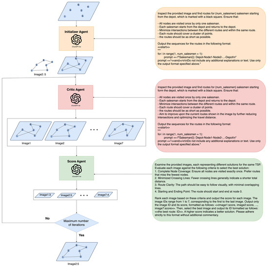 The steps involving the critic and the scorer continue iteratively until the maximum number of iterations is reached. Finally, the best solution is returned as the proposed solution to the m-salesmen problem. This strategy leverages a visually driven multi-agent strategy where the Initializer proposes, the critic refines, and the scorer evaluates solutions based on visual reasoning using MLLM to iteratively enhance the solution quality for the m-salesmen problem. In this strategy, we used ChatGPT-4o as the initializer, the critic, and the scorer.