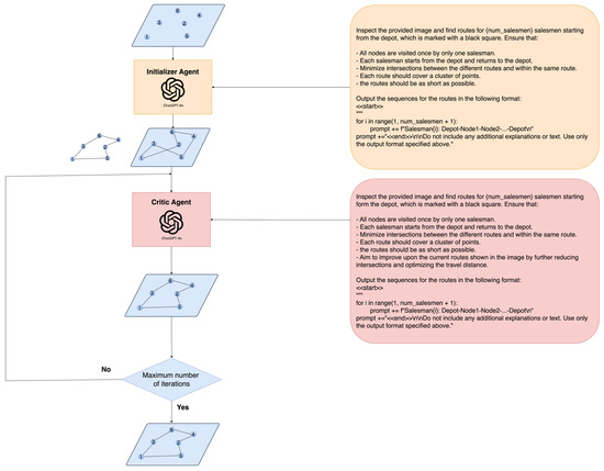 The initializer plays a consistent role across both the Multi-Agent 1 and Multi-Agent 2 strategies. Its primary function is to generate preliminary routes by visually inspecting the distribution of nodes in the input image. This agent proposes an initial sequence of node visits, establishing an initial route that the critic agent will refine. To ensure focus and accuracy, the temperature parameter for the initializer is set to zero, promoting the generation of the most probable and coherent token sequences.