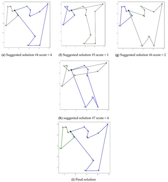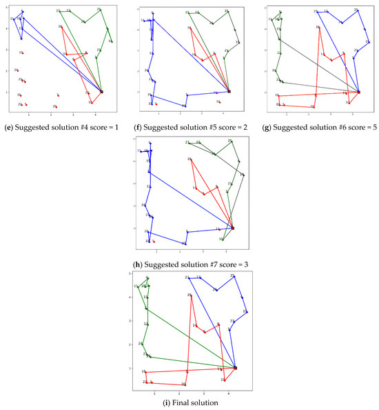 Visual representations of seven proposed solutions by the critic agent for two salesmen, along with scores assigned by the score agent, highlighting the iterative improvement process in the multi-agent system: (a) initial solution, (b–e,h) are suggested solutions, and (i) is the final solution. Different lines color represent different journeys. Numbers represent the nodes visited by the salesmen.