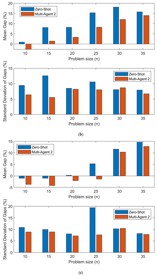Comparative performance of zero-shot and Multi-Agent 2 strategy across different salesmen configurations: analysis of mean gap and standard deviation by problem size: (a) one salesman; (b) two salesmen; (c) three salesmen.