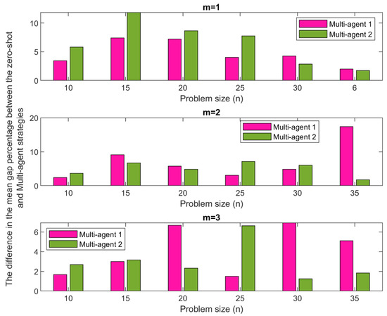 Comparative analysis of mean gap percentage reductions: evaluating Multi-Agent 1 and Multi-Agent 2 against zero-shot across different problem sizes and salesman configurations.