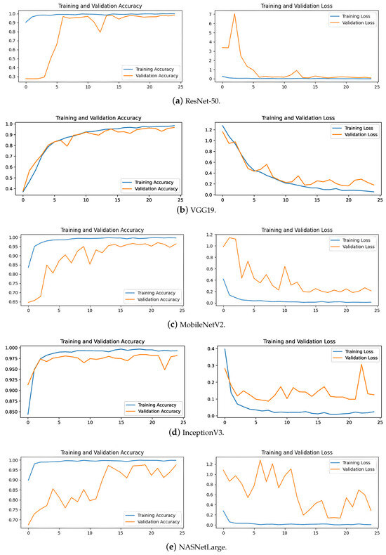 The final preprocessing step is resizing the images, which is essential for standardizing the input size of the images fed into the learning model. Deep learning models, particularly deep CNNs, require input images of a fixed size [28]. Resizing ensures that all images in the dataset conform to this required size, facilitating consistent processing and analysis. Standardizing the image size also reduces computational complexity and memory usage, enabling more efficient model training. During resizing, care is taken to preserve the aspect ratio of the images to avoid distortion, which could result in the loss of important features. In this experiment, the images were resized to pixels, except for NASNetLarge, which required an input size of pixels.