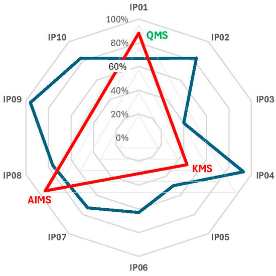 Finally, 50% of organisations confirmed plans to implement a KMS, and 97% planned to implement an AIMS. Figure 2 illustrates the percentage of organisations addressing the identified issues (IP01 to IP10) in blue, the percentage of organisations planning to implement KM and AI management systems in red, and the percentage of organisations with an already implemented QMS in green.