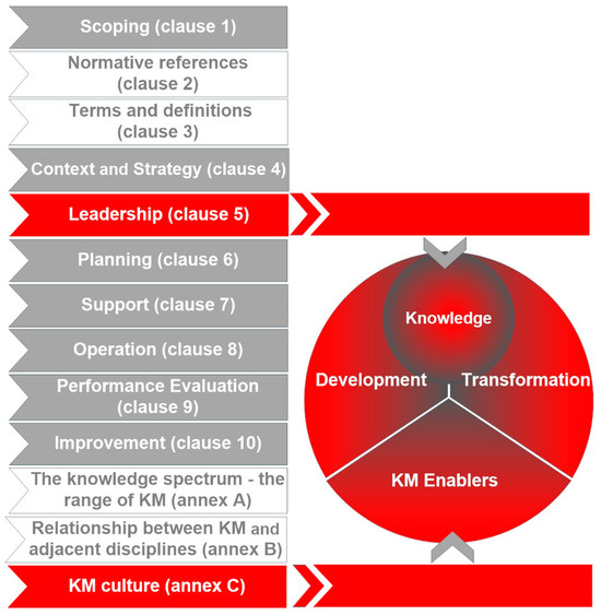 Some scholars have attempted to analyse ISO 30401. Corney summarised the advantages and disadvantages of ISO 30401 according to their experience in the drafting process [26]. Kudryavtsev and Sadykova studied how ISO 30401 may be included in enterprise architecture models, combining knowledge management with other management systems and with technologies and IT systems in the organisation [27]. Maximo et al. first visualised the standard’s structure and determined crucial strengths and weaknesses for practical implementation [4]. Pawlowsky et al. analysed how ISO 30401 relates to the theoretical origins of KM and Intellectual Capital research. The authors discuss how ISO 30401 may contribute to value creation [28].