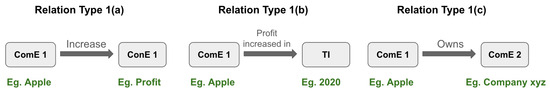 - Relation Type 1b: The source node can be a ComE, and the destination can be a TI (Temporal Node). The edge represents the ConE concatenated with its relation, for example, “profit increase in”.