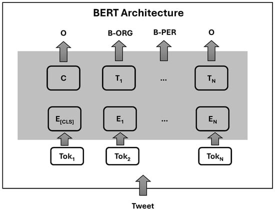 Figure 4 illustrates the architecture of the BERT model applied for Named Entity Recognition (NER). The model processes a tweet as input, tokenizing the text into individual tokens (, , …, ). Each token is fed into BERT, which generates embeddings (E(CLS), , …, ) for each token. The output of BERT is then passed to classification layers that assign tags to each token, identifying named entities such as organizations (B-ORG), persons (B-PER), and non-entity tokens (O). This structure allows the model to effectively classify and recognize named entities within the unstructured textual data of the tweet. The following are the steps: