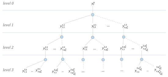 Schematic diagram of the three-level hierarchical system of the variable y. Level 3 contains all the target variable models; it is the level with the most detailed predictions, so the relationships of the third-level predictions are built into level 2, and the constraints of levels 2 and 3 are built into level 1. Even at level 0, the total prediction constraints determine the y value. Among the subscripts of y, the first, t, is the time, and the second, , is the number of child nodes at the given level. Among the superscripts, the first, , is the number of hierarchical levels, and the second, p, denotes the number of parent nodes.