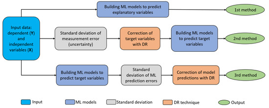 Based on the available information, ML models can be developed in three ways, as presented in Figure 2. The first route is to develop an ML model without any DR. The second route is that if there is information about the measurement uncertainty, then the inverse covariance matrix can be defined with the standard deviation of the measurement errors, and then DR can be performed on the measured dataset. Since the measurements are independent from each other, the covariance matrix for DR contains non-zero values only in the diagonal elements. After DR, ML models can be developed using the reconciled dataset.