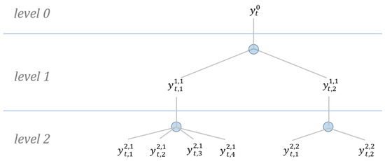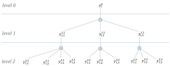 Schematic diagram of the two-level hierarchical structure’s target variable () in the M5 forecast—an accuracy competition. In the hierarchical levels, level 0 is the country level, level 1 is the state level, and the level 2 is the shop level.