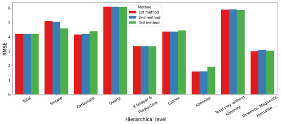 In the following, the results of the development of ML models for each method are presented through the average prediction errors and through the hierarchical balance error. The results of different hierarchical levels and different methods were compared with the root-mean-squared error of the prediction () value, which indicates the accuracy of each estimate. At the first level, the third method performed the best for silicate ( = 4.577%), and the first method was the best ( = 4.154%) for carbonate, but here, the balance error was not met. The most significant difference is seen between the kaolinite values at the two levels, where the first method performed the best ( = 1.584%), but in this case, the balance errors were not met either.