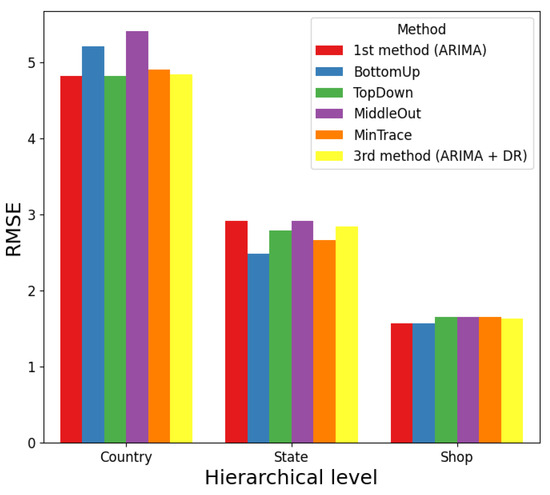 Figure 6 illustrates the performance of several forecasting models along with their hierarchical results. The metric used is the , displayed on the y axis. Different DR techniques are shown on the x axis, with colours indicating the hierarchical levels. In general, the middle-out method has the highest (2.421), while the bottom-up method has the lowest (2.241). Despite the small overall differences in the , the bottom-up method is the best performer. At the country level, the top-down method has the highest (5.408), whereas the bottom-up method, with a significantly lower (4.822), is more efficient and suitable for country-level forecasting. At the state level, the top-down method has the highest (2.911), while the bottom-up method has the lowest (2.487). In this category, the bottom-up method is the most effective. At the shop level, there are slight differences among all four methods. The top-down method has the highest (1.656), while the bottom-up method has the lowest (1.569).