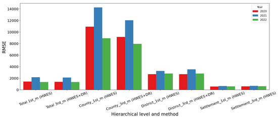 Figure 7 shows the RMSE value of the model errors, taking into account the national level, including all counties, all districts, and all settlements, in 2020, 2021 and 2022. Figure 7 clearly shows that the biggest errors are at the county level, and these errors are lower if DR is applied after ML. Taking into account the years, the highest error is seen in 2021, and the lowest is seen in 2022.